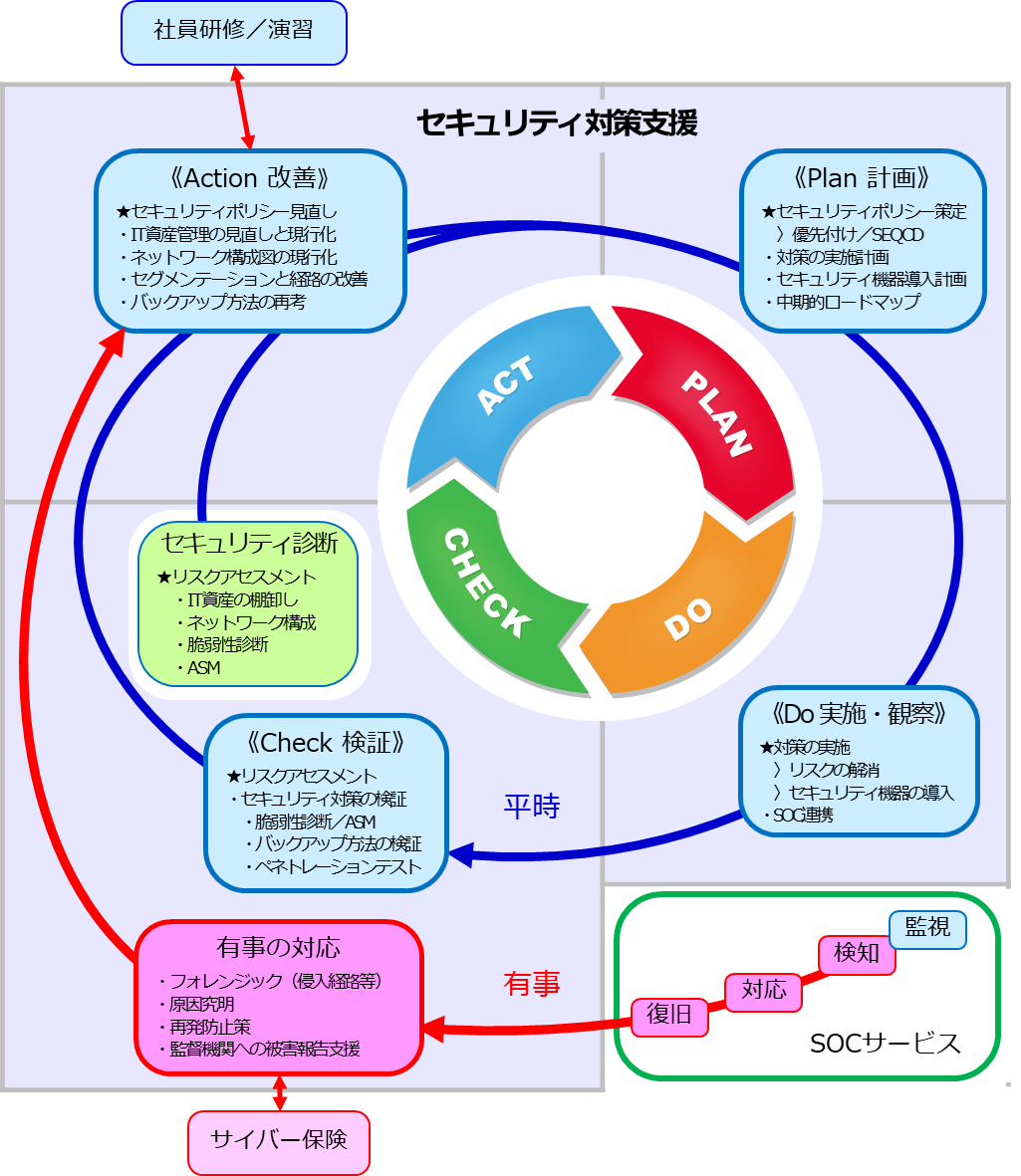 一般的な対策だけでなく、お客様と目線を合わせながら、事業規模や実態に即したセキュリティポリシーを共に策定し、現場主義で対策の実施を伴走させていただきます。さらに対策後の検証や次ステップの改善を繰り返し重ねていくPDCAサイクルを支援していきます。